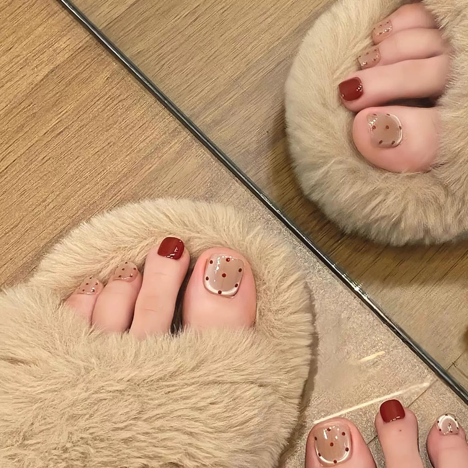 Embrace refined elegance with our Handmade Nude & Cherry Red Cat Eye Toe Nail Press-Ons. Featuring a subtle nude base and rich cherry red accents enhanced by a luminous cat eye effect, this set offers a balance of softness and bold allure. Fully handcrafted and designed for comfort, these detachable press-on toe nails provide a salon-quality finish you can apply and remove at home—effortlessly.